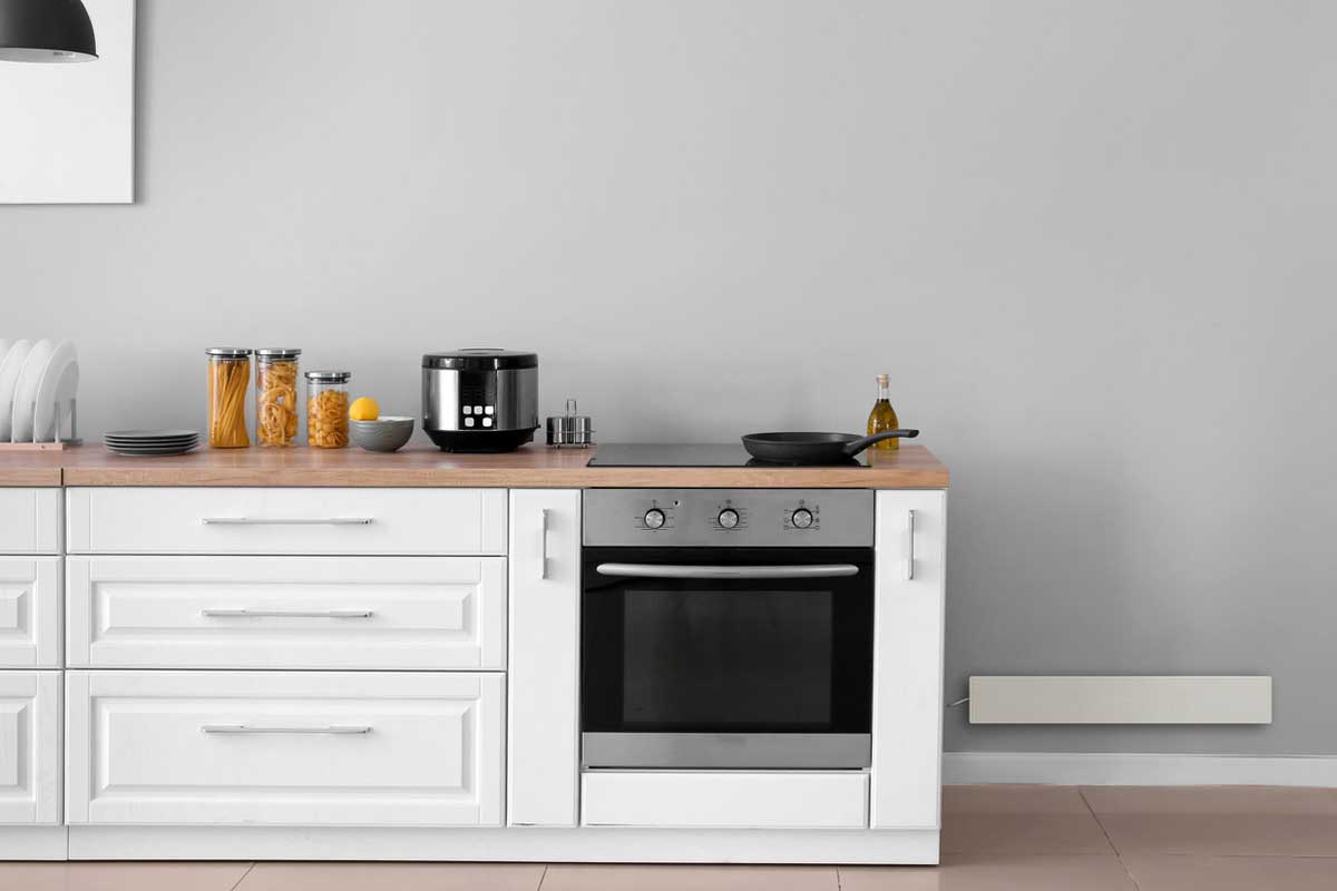 Bei Küchenmöbeln ist im Sockelbereich eine Höhe von ca. 12 cm ausreichend, um Schimmel-DRY auf Standfüßen ganz nach hinten zur feuchten Wand zu schieben.